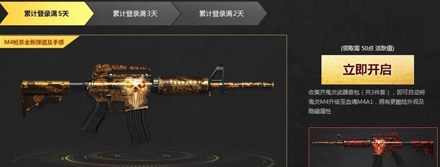 累计登录天数,还可使用活跃值直接领取游戏内的神器、神兽枪及专属永久武器:鬼炎M4(永久)。但每天仅限领取一把武器,每把武器活动期间仅限领取一次。